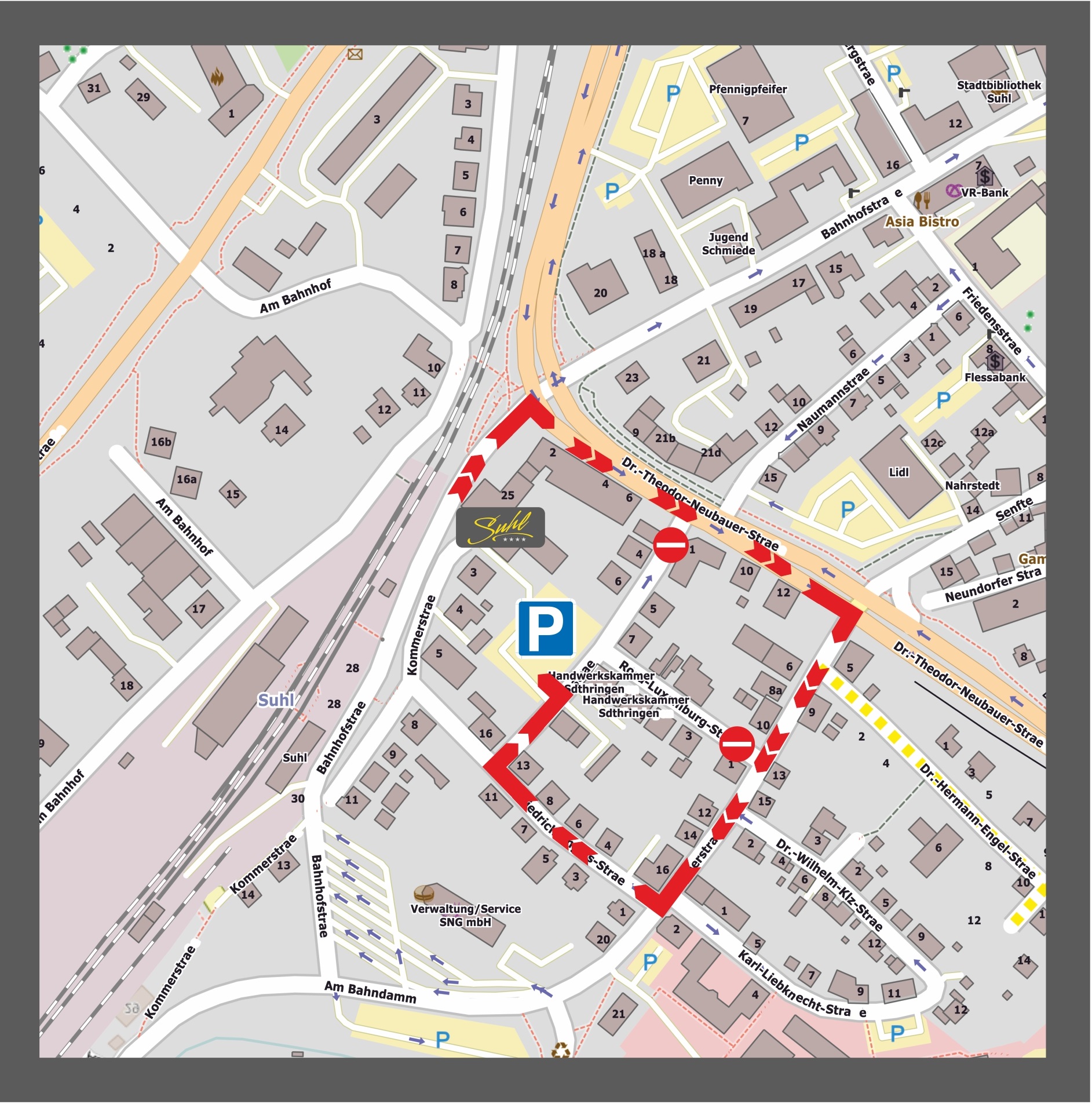 Das Grand Hotel Suhl liegt in unmittelbarer Nähe des Suhler Bahnhofs (ca. 50 m), bis ins Stadtzentrum sind es nur 5 Gehminuten (ca. 500 m).